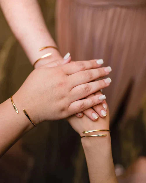 Our Engraved Adjustable personalised Bangle makes a stunning visual impression while providing a comfortable, secure fit. This gorgeous piece features a slim band with slightly flared ends. Each end has space for an inscription of your choice, so the finished piece carries a special meaning.